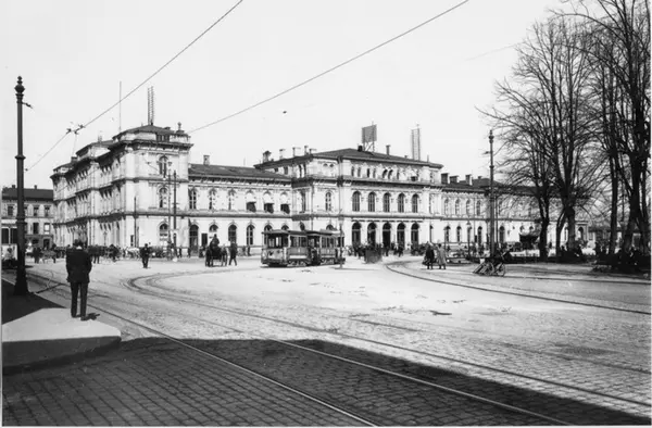 Blåtrikk tilhenger (fra 1894) type Kühlstein nr. 146 linje 3, Jernbanetorget-Bygdø (Skøyen) i vendesløyfa ved Strandgata og Christian Frederiks plass foran Østbanebygningen. (Mellom 1902 og 1924 hadde Blåtrikkens vogner tresifrede numre (fra 101), tidligere var de tosifrede. Dette for å skille dem fra konkurrenten Grønntrikkens vogner.) Bilde tatt en gang mellom 1915-1925.