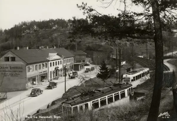 Oslo Sporveier. Forstadstrikker på (Lilleaker-) Østensjøbanen, motorvogn 33 type A (fra 1926) med tralle og Gullfisktrikk type B1(fra 1939). Forretninger i Østensjøveien 60-64 på Bryn. Postkort 76 C 86. Bilde tatt en gang mellom 1950-1955.