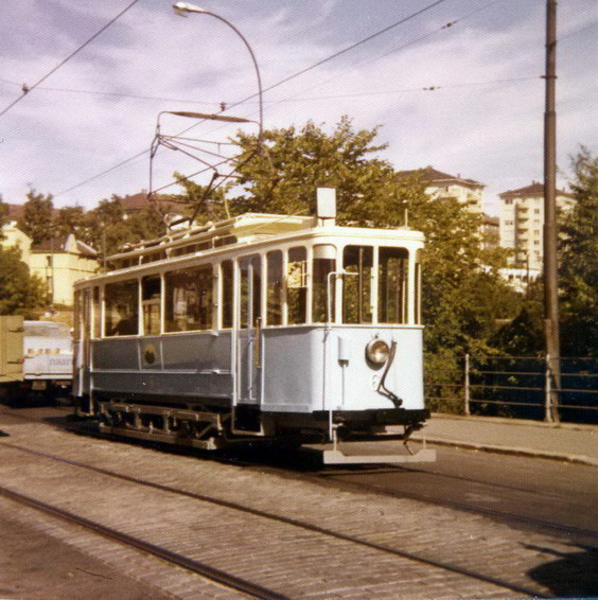 Oslo Sporveier. Veterantrkk, motorvogn 6 (fra 1899) type AEG, prøvekjøring i forbindelse med Sporveiens 100-års jubileum i 1975. Her på Bentsebrua. Utrangert for passasjertrafikk 1961, står idag på Sporveismuseet.
