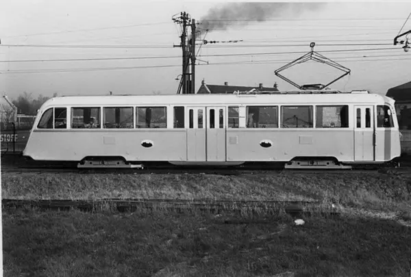 Oslo Sporveier. Trikk motorvogn 184 type Gullfisk B1, nylevert fra Strømmens Værksted, ute på prøvekjøring i desember 1938. Ved Etterstad vognhall. B-vognene ble brukt på forstadsbanene, i motsetning til E-vognene, som frem til 1949 var rene byvogner. Da ble flere etterhvert overført til Bærumsbanen, etter 1956 var kun vogn 163 tilbake i byen (tatt ut av trafikk i 1957).