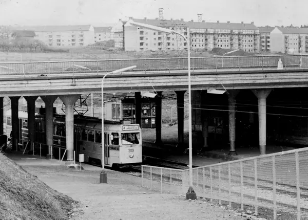 Oslo Sporveier. Trikk motorvogn 209 type Høka MBO på linje 4, Lambertseterbanen, under brua ved Ryen stoppested. Blokkbebyggelsen i Rugveien i bakgrunnen under oppføring.
