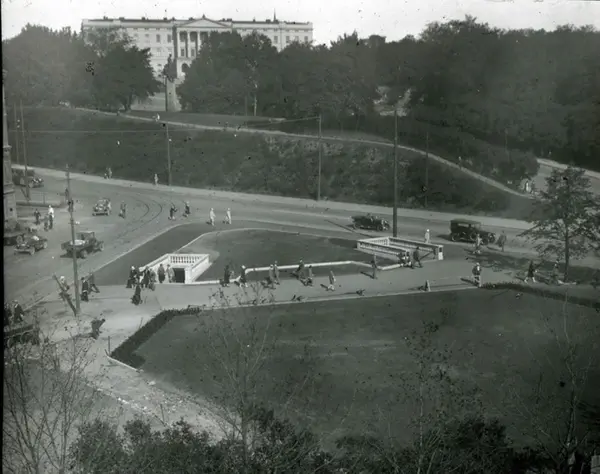 Krysset Stortingsgata - Frederiks gate - Drammensveien med Slottsparken (Abelhaugen) og Slottet i bakgrunnen. Nedganger til Undergrunnsbanen ved nåværende Johanne Dybwads plass. Trafikkmiljø, spaserende.