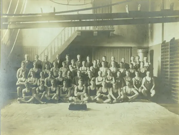 Gruppebilde av medlemer av Sportsklubben 1909. Signatur på bildet sier: Th. Thorkelsen Carl Johan Hj. Øvre Slotsgd. Hit flyttet fotografen i 1905. I fotografregisteret står det at etter 1919 spesialiserte han seg på gamle bilder og reproduksjoner. Bildet er altså trolig tatt en gang i perioden mellom 1905 og 1919.