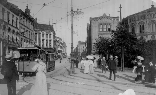 Grønntrikk til Munkedamsveien i Karl Johans gate mot Rosenkrantz' gate ved Grand Hotel, Eidsvolls plass og Stortinget. Hattekledte damer og herrer flanerer i fintøyet. Postkort 18.