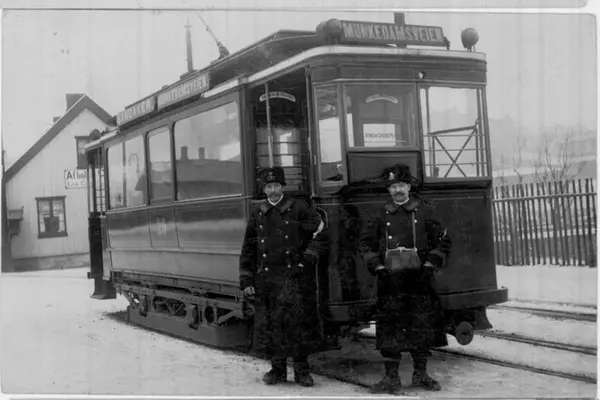 Grønntrikk. Trikk motorvogn 29 på linje 11, Sandaker-Munkedamsveien (1924-1927). Vognfører og konduktør poserer for fotografen. Avholdskafé i bakgrunnen.