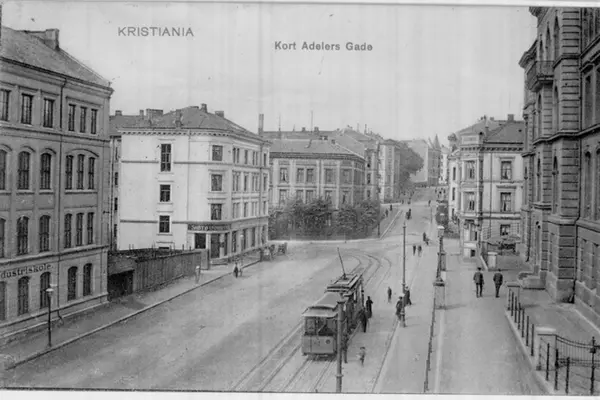 Cort Adelers gate ved Christiania tekniske skole til høyre (nåværende Oslo ingeniørhøgskole). Grønntrikk mot Huitfeldts gate til Munkedamsveien. Postkort.