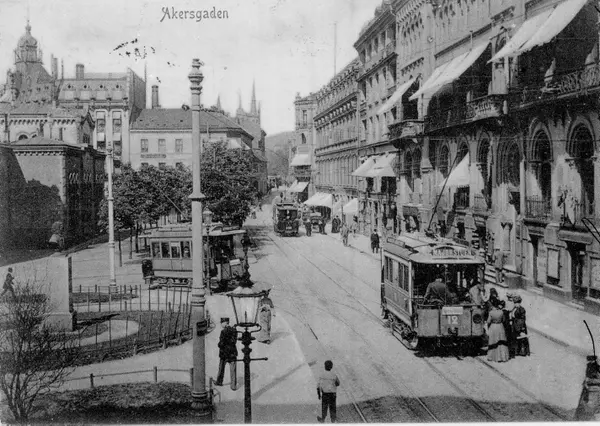 Trikker ved Akersgata ovenfor Wessels plass, ved Athenæum. Trikk med vognnummer12 til Majorstuen nærmest, gatelykt, lyktestolper, spaserende mennesker. Portrettbyste av Johan Herman Wessel (fra 1891). Postkort muligens fra engang mellom år 1899 og 1905.