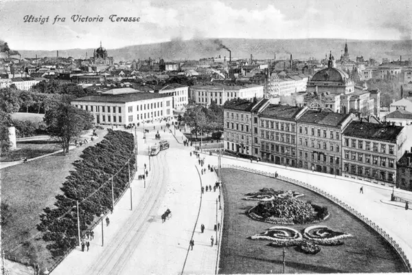 Drammensveien med trikk, hesteekvipasje og spaserende mellom Abelhaugen og en blomsterprydet Triangelplassen (nåværende 7. juni plass). Universitetet, Nationaltheatret. Gamle bygårder, Ruseløkkveien 2-6B.