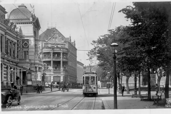 Stortingsgata ved Tivolibygningen, inngangsbygningen til Tivoli (fra 1890, revet 1934) og Hotel Continental. Trikk, åpen bil, hesteekvipasje. Gatelykter. Postkort 1032.