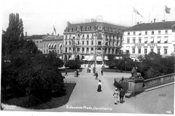 Eidsvolls plass ved Løvebakken. Granittløve på sokkel. Spaserende. Grand Hotel. I midten forretningsgård (fra 1899), Karl Johans gate 33 (her som Hotel Nobel, fra 1901). Postkort 142.