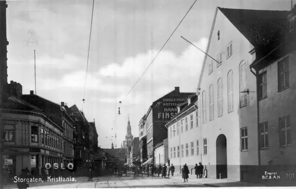 Storgata med Tukthuset til høyre. Trikker, spaserende. Domkirkespiret i bakgrunnen. Veggreklame (Storgata 31) for Haakon Finstad herreekvipering. Postkort 101.