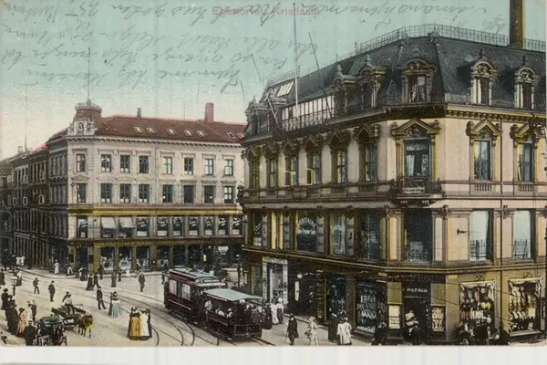 Egertorget. Forretningsgård, Karl Johans gate 20, til høyre. Trikk, hester og kjerrer, spaserende. Butikker, butikkskilt. (Freiareklamen ennå ikke på plass på hjørnegården i Øvre Slottsgate 12 , bildet derfor tatt før 1911.) Håndkolorert postkort.