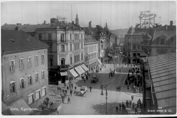 Karl Johans gate ved Akersgata og Egertorget mot Østbanen. Fru Byes Hotel (Akersgata 26), Freia lysreklame (fra 1909). Biler, spaserende. Postkort 128.