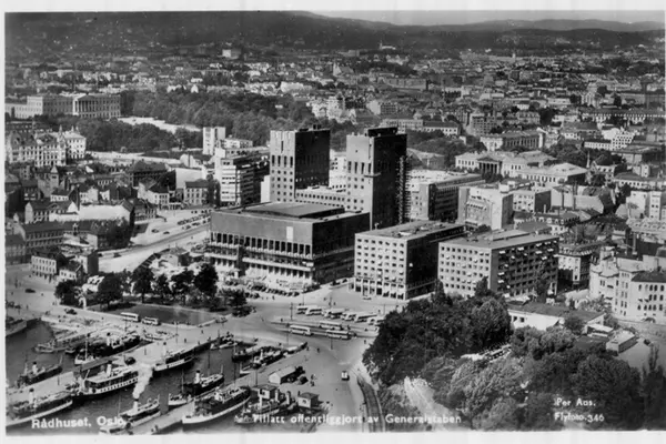 Oversiktsbilde av Rådhuset, Rådhusplassen ( med bussterminal), Rådhusbryggene (utstikkere), Skansen restaurant, Kontraskjæret, gamle Vika. Båter. Postkort 346 med tilleggstekst: Tillatt offentliggjort av Generalstaben. (Flyfoto)