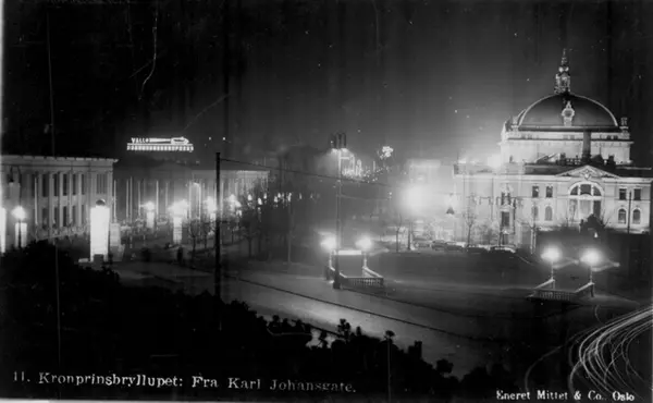 Flombelyst Øvre Studenterlunden med nedganger til Undergrunnsbanen. Nationaltheatret, Universitetet. Bilde tatt om kvelden 21. mars 1929 på kronprins Olav og kronprinsesse Märthas bryllupsdag. Karl Johans gate pyntet med lyssøyler. Postkort 11.