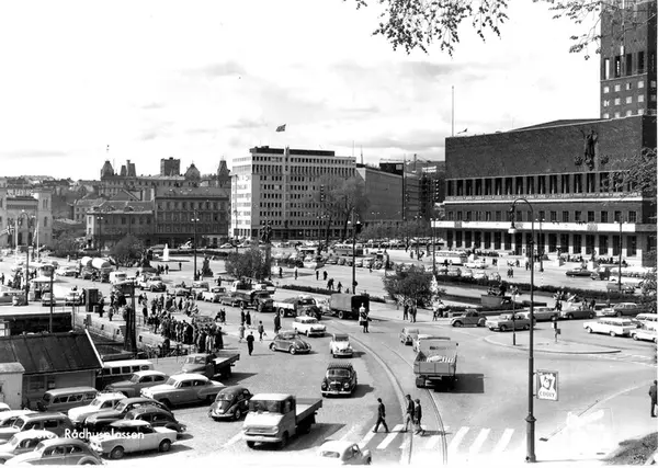 Rushtrafikk på Rådhusplassen og Akershusstranda. Parkerte og kjørende biler, busser, gående, folk i båtkø. Rådhuset, gamle Vika, nye forretningsbygg (Thiis-gården). Postkort.