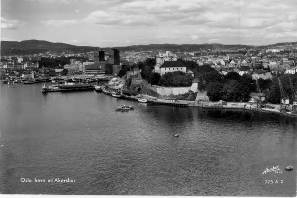 Akershus slott og festning sett fra sjøsiden. Havnekraner og båter langs Akershusstranda. Pipervika med Akershusutstikker og Rådhuset. Postkort 773 A 2.