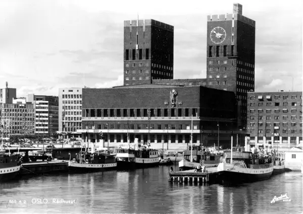 Oslo Rådhus, kontorbygg og Rådhusbryggene (utstikkere) sett fra sjøsiden. Dampbåter, havnemiljø. Ved Utstikker B ser vi akterenden av D/S Fjellstrand, innenfor ligger D/S Spro og deretter D/S Kronprins Olav. Ved Utsikker A ligger D/S Nesodden på vestsiden, og på østsiden ligger D/S Ursvik, D/S Bundefjord ligger innerst. Postkort 868 A 2.Datering: 1950-1954