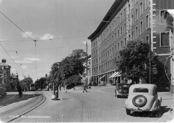 Drammensveien ved Oslo lysverkers administrasjonsbygning, Sommerrogata 1. Sommerroparken. Noe av Det engelske kvarter helt til venstre. Trikk, biler. Postkort 87 A 3.