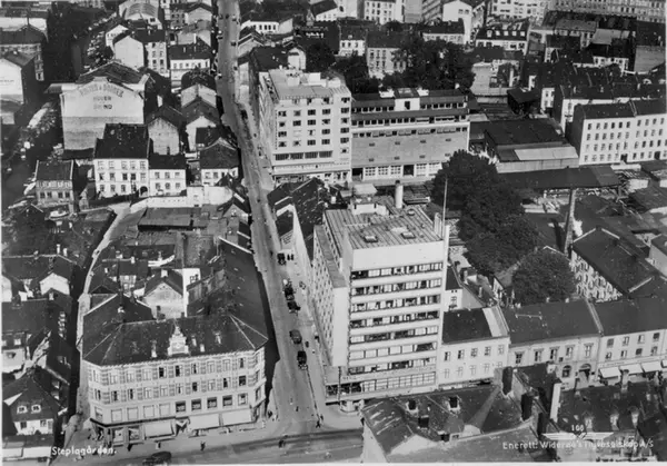 Gammel og nåværende bebyggelse rundt krysset Grønland - Lakkegata og langs Breigata. Høybygget Steplagården, Grønland 4 (forretningsbygg fra 1932). Postkort 106. (Flyfoto)