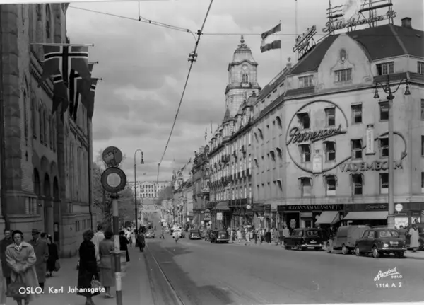 Karl Johans gate fra Stortings plass til Slottsbakken. Brambanigården med vegg- og takreklame. Grand Hotel. Biler, spaserende, ventende ved Stortinget trikkestoppested. Postkort 1114. A 2.