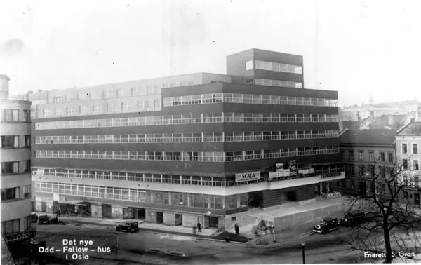 Odd Fellow-bygningen (fra 1934) i Stortingsgata, hjørnet mot Roald Amundsens gate (nåværende Olav Vs gate). Scala revyscene (senere kino), reklameplakater. (Gamle bygåder ved utløpet av Munkedamsveien, Torstedgården fra 1935 ennå inne oppført.) Postkort.