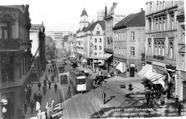 Karl Johans gate fra Egertorget og Akersgata til Slottsbakken. Fru Byes Hotel, Tostrupgården, Brambanigården, Grand Hotel. Butikker, reklame. Trikk, biler, drakjerre, spaserende. Postkort 1130.