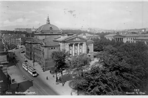 Nationaltheatret med Studenterlunden. Trikk i Stortingsgata. Universitetet. (Helt til venstre foran ses litt av Tivolis inngangsbygning, revet 1934). Gammel bebyggelse i Munkedamsveien bak til venstre. Postkort 1211.