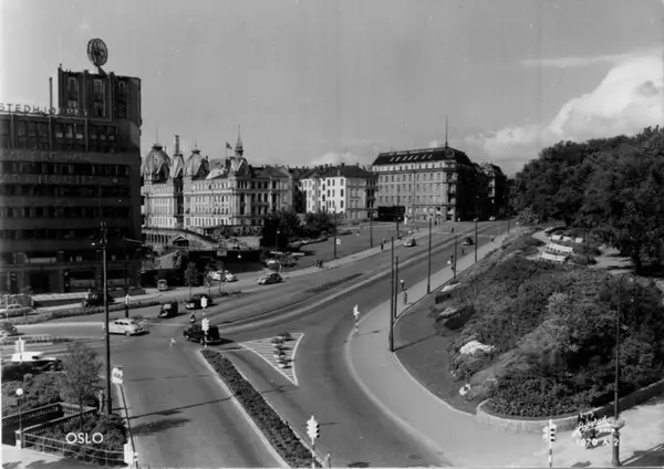 Gatekrysset Frederiks gate - Drammensveien - Stortingsgata med trafikklys. Abelhagen. Torstedgården, Victoria terrasse, Triangelplassen (7. juni plass fra 1962). Nedgang til Undergrunnsbanen. Postkort 1070 A 2.