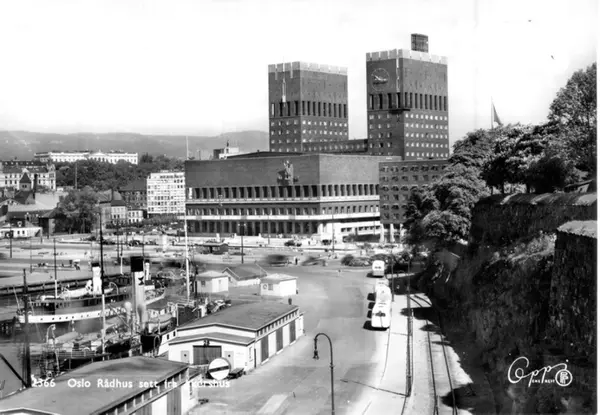 Rådhuset og Rådhusplassen sett fra nordre Akershuskai og Akershusstranda. Havneskur / havnelager, Rådhusbrygger, dampbåter. Havnebanen. Busser, biler. (Bak ses gammel Vikabebyggelse langs Skolegata.) Postkort 2366.