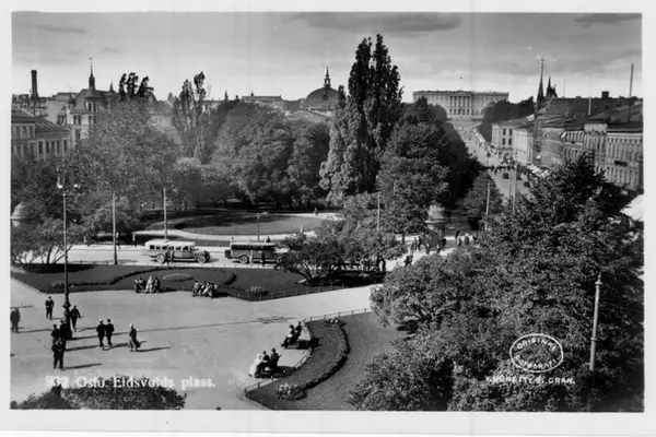 Eidsvolls plass sett fra Stortinget. Busser i Rosenkrantz' gate, folk på parkbenker, spaserende. Postkort 932 med påtrykket stempel: ORIGINAL FOTOGRAFI.