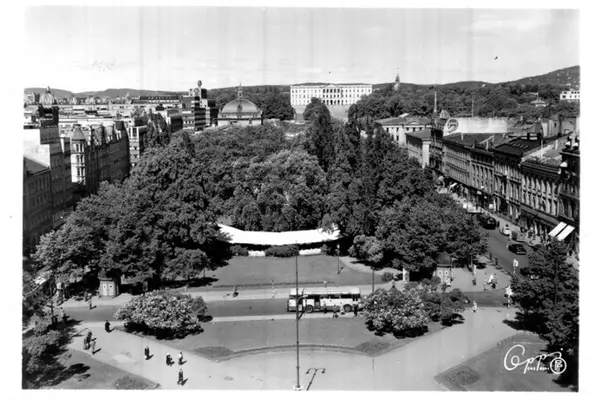 Eidsvolls plass sett fra Stortinget. Saras telt. Karl Johans gate, Stortingsgata. Buss i Rosenkrantz' gate, biler, spaserende. Narvesens kiosker. Slottet. Postkort.