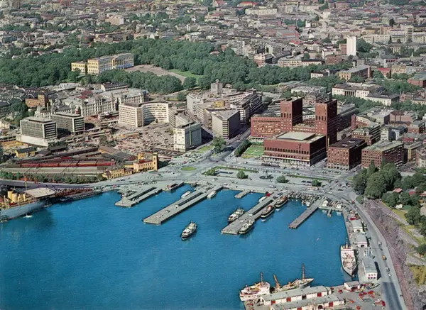 Pipervika med Rådhuset, Rådhusplassen, Rådhusbryggene (Utstikker A til D): M/S Tyrihans eller M/S Prinsessen (søsterskip) er i ferd med å bakke ut fra Utstikker B, mens den andre ligger fortøyd på vestsiden av utstikkeren. På østsiden ligger M/S Oksvald og M/S Nesodtangen (søsterskip). Ytterst på denne siden ligger M/S Prinsen. Nye Vika med kontor- og forretningsbygg. Vestbanen, Vestbaneområdet, nordre Akershuskai, Akershusutstikkeren, havneskur, Akershusstranda. Slottet, Slottsparken. Postkort. (Flyfoto)