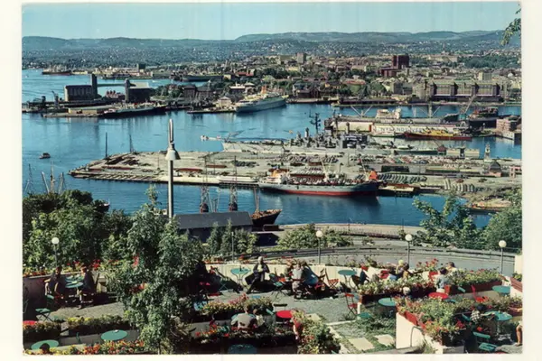 Sørenga, Sørengkaia, Vippetangen (med kornsiloer), Akershus festning og Havnelageret sett fra Ekebergrestaurantens uteservering. Havnelagre, havneskur, havnekraner, båter, orlogsfartøy, amerikabåt ved Utstikker I, skip i dokk ved Nylands mek. Verksted. Postkort.