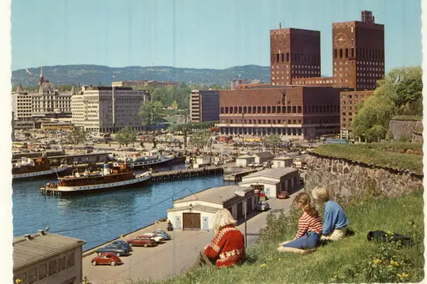 Rådhusbrygger med Nesoddbåter, gamle skuter, Rådhusplassen, Rådhuset, Wilhelmsengården, Thiisgården og Victoria terrasse sett oppe fra festningsmuren langs nordre Akershuskai. Havneskur. Tre jenter nyter utsikten. Postkort.