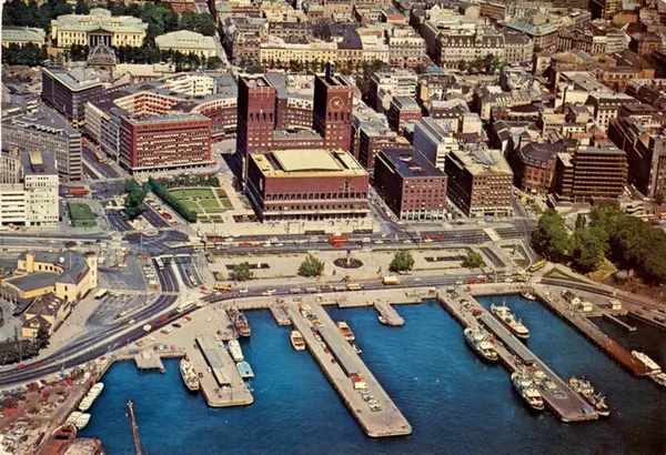 Rådhusbryggene (1 til 4 fra høyre) med båter: søsterskipene M/S Tyrihans og M/S Prinsessen fortøyd ved vestsiden av Rådhusbrygge 2. På østsiden ligger M/S Prinsen innerst og M/S Veslefrikk ytterst.Rådhusplassen, Rådhuset, Borggården, Kronprinsesse Märthas plass og Vestbanen sett ovenfra fra syd. Kontor- og forretningsbygg. Dokkveien, Dronning Mauds gate, Roald Amundsens gate (dagens Olav Vs gate), Hieronymus Heyerdahls gate, Tordenskiolds gate, Rosenkrantz' gate. Universitetet bak til venstre. Postkort. (Flyfoto)Rådhusbryggene skiftet navn fra utstikker A-D til Rådhusbrygge 1-4 i 1974.