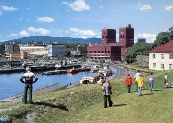 Rådhusbryggene: innerst ligger M/S Huldra og M/S Prinsen. På andre siden i M/S Tyrihans eller søsterskipet M/S Prinsessen. Foran denne båten skimter vi litt av M/S Lykkeper. Rådhusplassen, Rådhuset, Vestbanen, Wilhelmsengården, Thiisgården sett oppe fra festningsvollen langs nordre Akershuskai. Havneskur. Laboratoriekjøkkenet til høyre. Ungdommer nyter utsikten. Postkort. Oransje, liten båt er M/S Mikkel (senere omdøpt til Veslefrikk), en liten hurtigbåt som A/S Nesodden-Bundefjord fikk levert i 1974.Datering: 1974-80