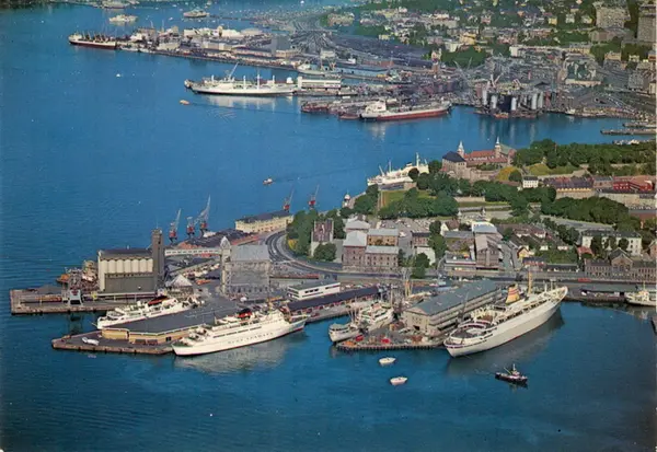 Vippetangen med Utstikker I med Amerikabåt ved Amerikalinjens terminalbygning, Utstikker II med danskebåter og Utstikker III med kornsiloer. Vippetangkaia, bryggekraner, havnebygninger, havnelagre. Skip, båter. Akershus slott og festning. Akershusstranda. Pipervika bak med Akers mek. Verksted, oljeplattform under bygging. Filipstad bakerst. Postkort.