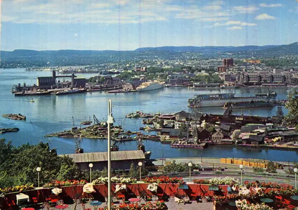 Sørenga, Sørengkaia, Vippetangen (med kornsiloer), Akershus festning og Havnelageret sett fra Ekebergrestaurantens uteservering. Havnelagre, havneskur, havnekraner, båter, Amerikabåt ved Utstikker I, skip i dokk ved Nylands mek. Verksted. Postkort.