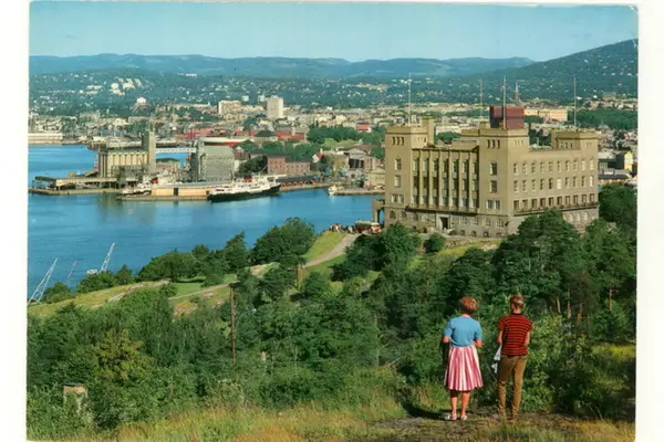 Sjømannsskolen, Vippetangen og Akershus festning sett fra Ekebergskråningen, på oversiden av Karlsborgveien. Kornsiloer, danskebåt. Gutt og jente nyter utsikten. Postkort.
