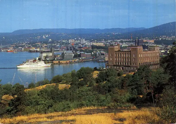 Sjømannsskolen, Vippetangen og Akershus festning sett fra Ekebergskråningen, på oversiden av Karlsborgveien. Kornsiloer, danskebåt inn mot Utstikker II. Postkort.