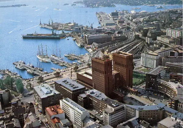Rådhusbryggene med M/S Prinsen innerst på vestsiden av Rådhusbrygge 2.Utenfor ligger M/S Huldra. Ytterst på vestsiden ligger M/S Tyrihans eller søsterskipet M/S Prinsessen. M/S Lykkeper ligger innenfor. Helt til venstre i bildet ser vi litt av den pensjonerte minesveiperen KNM Alta. Rådhuset, Borggården, Rådhusplassen. Kontor- og forretningsbygg. Vestbaneområdet, Akers mek. Verksted, Tingvallakaia, skip i dokk, havnekraner. Tjuvholmen, Filipstad. Dokkveien, Rosenkrantz' gate. Postkort.Datering: 1974-80
