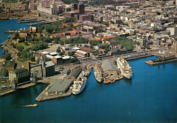 Vippetangen med kornsiloene, Fiskehallen, Utstikker I og II (med danskebåten), Revierkaia, Akershus slott og festning. Akershusstranda. Amerikabåt ved Amerikalinjens terminalbygning, Utstikker I. Havnelagre, terminaler. Pipervika med Rådhuset i bakgrunnen. Postkort. (Flyfoto)