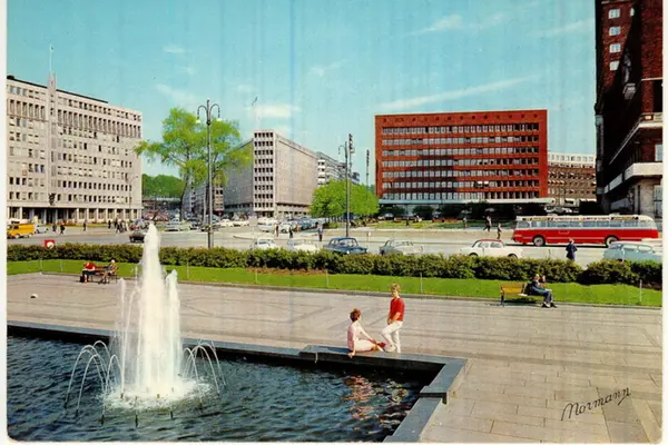 Vestre basseng med vannfontene. Jenter ved bassengkanten, folk på parkbenker. Kontor- og forretningsbygg, Wilhelmsengården til venstre, Thiisgården i midten, Kronprinsesse Märthas plass 1 til høyre. Haakon VIIs gate, Roald Amundsens gate (nåværende Olav Vs gate). Buss, biler. Postkort.