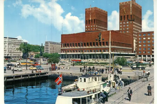 Fiskeskøyta M/K Barodd ved Rådhusbryggene, Utstikker A. Rådhusplassen, Rådhuset, kontor- og forretningsbygg (Wilhelmsengården, Thiisgården). Telefonkiosk, bryggeliv, busser, biler. Postkort.Datering: 1960-1965.