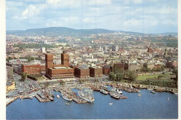 Rådhusbryggene (1-4 fra høyre) og nordre Akershuskai med seilskuter, ferger og mindre båter. Ved Rådhusbrygge 2 ligger fire nesoddbåter: På østsiden M/S Prinsen, M/S Huldra. M/S Lykkeper og M/S Tyrihans eller søsterskipet M/S Prinsessen på vestsiden.Rådhusplassen, Rådhuset, Kronprinsesse Märthas plass, Vestbanen. Kontor- og forretningsbygg. Kontraskjæret. Dokkveien, Roald Amundsens gate, Rådhusgata, Akershusstranda. Postkort. Datering: 1974-1980. (Flyfoto)