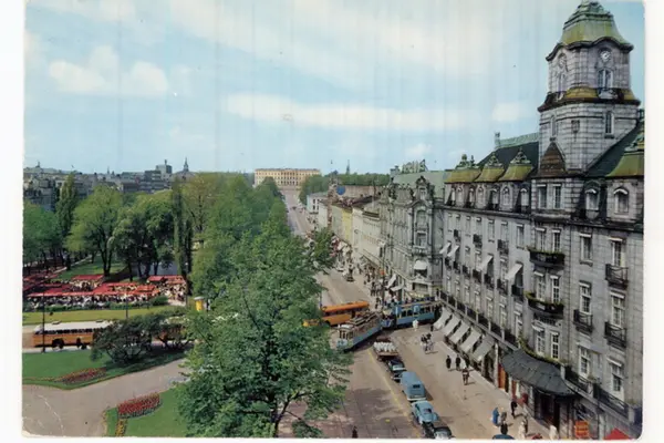 Eidsvolls plass langs Karl Johans gate fra Grand Hotel. Saras telt, uterestaurant. Kontor- og forretningsgårder. Trikk inn i Rosekkrantz' gate, busser, biler, spaserende. Postkort.