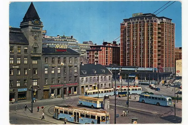 Torget med trikker, trikkesløyfe og busser ved terminal. Jernbanetorget 4 og 6. Hotell Viking, Gunnerus' gate 3. Butikker, butikkskilt, tak- og veggreklame. Postkort.
