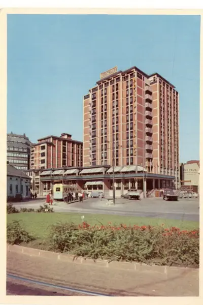 Hotell Viking i Gunnerus' gate (fra 1967 Biskop Gunnerus' gate), sett fra Jernbanetorget. Takreklame. Trikk på stoppested etter sløyfe 5, lastebiler. Postkort.