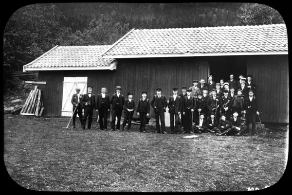 En gruppe menn og ungdommer i penklær poserer for fotografen foran et uthus eller låve. Ved Sundvolllen, Krokkleiva eller Kleivstua? Sannsynligvis 17. august 1902
